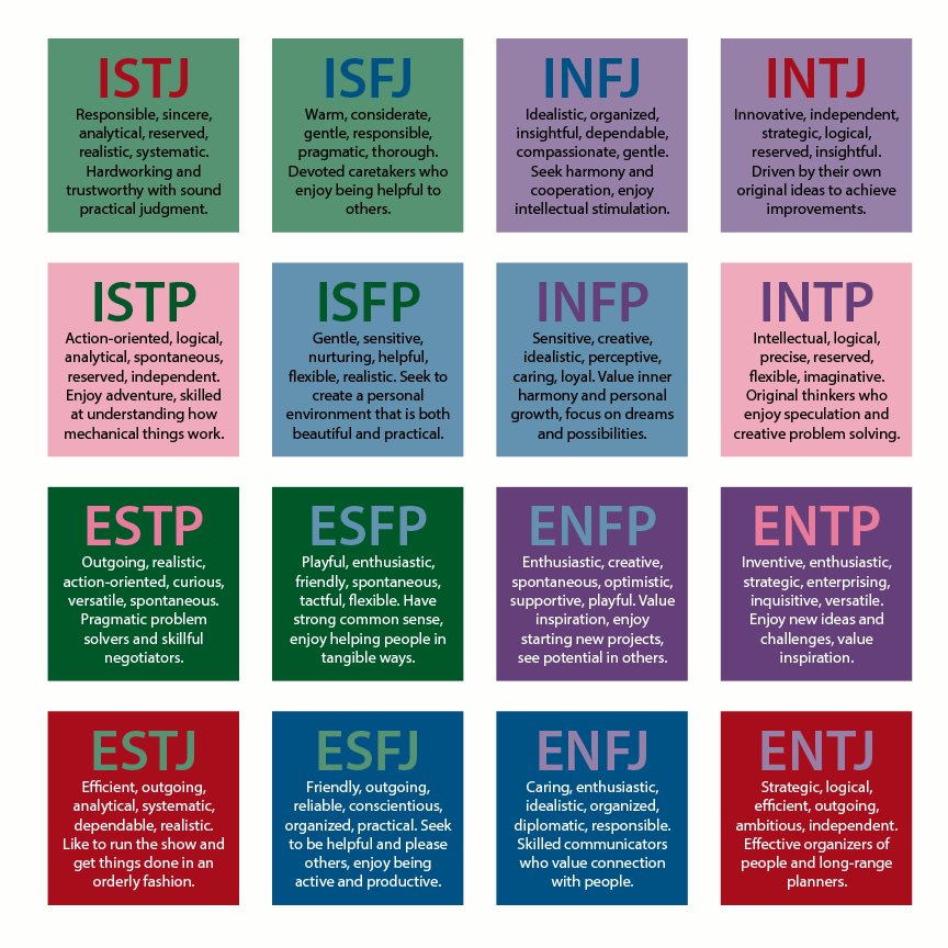 이에 따라 MBTI의 성격유형은 16 가지 유형으로 발생할수 있고요. 16 가지 성격유은 ISTJ, ISTP, ESTP, ESTJ, ISFJ, ISFP, ESFP, ESFJ, INFJ, INFP, ENFP, ENFJ, INTJ, INTP, ENTP, ENTJ 이런 방법으로 나누고 있다고 합니다.